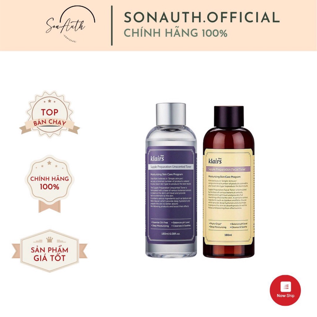 Toner Klairs ❤️FREESHIP❤️dành cho da nhạy cảm ngừa mụn Klairs Supple Preparation Toner chai 180ml[ có HĐ ĐỎ +TEM PHỤ]